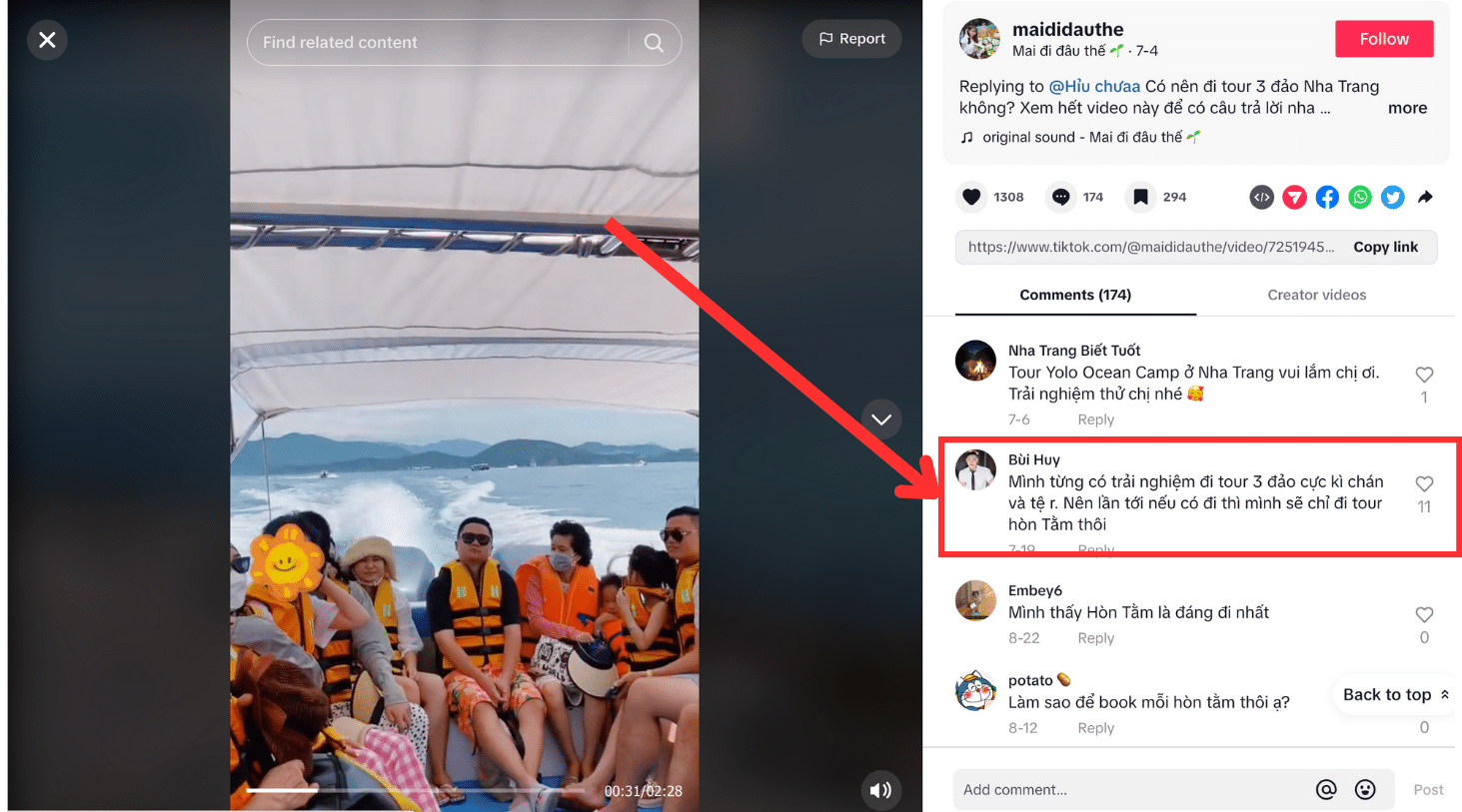 Trước hết, phải nói rằng mình có 1 trải nghiệm tìm kiếm trên Tiktok rất tệ, với 1 từ khóa “review tour đảo Nha Trang” thì Tiktok cho ra hầu hết là kết quả từ 01 tài khoản (có nhiều lượt tương tác) , phải tốn khá nhiều thời gian thì mình mới tìm được thêm các kết quả từ tài khoản khác (- càng đa dạng, càng có nhiều thông tin)